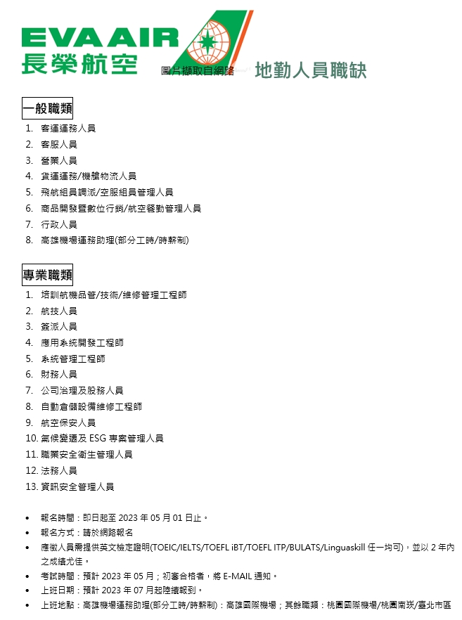 徵才網站連結 https://www.evaair.com/zh-tw/about-eva-air/careers/job-openings/ground-positions/